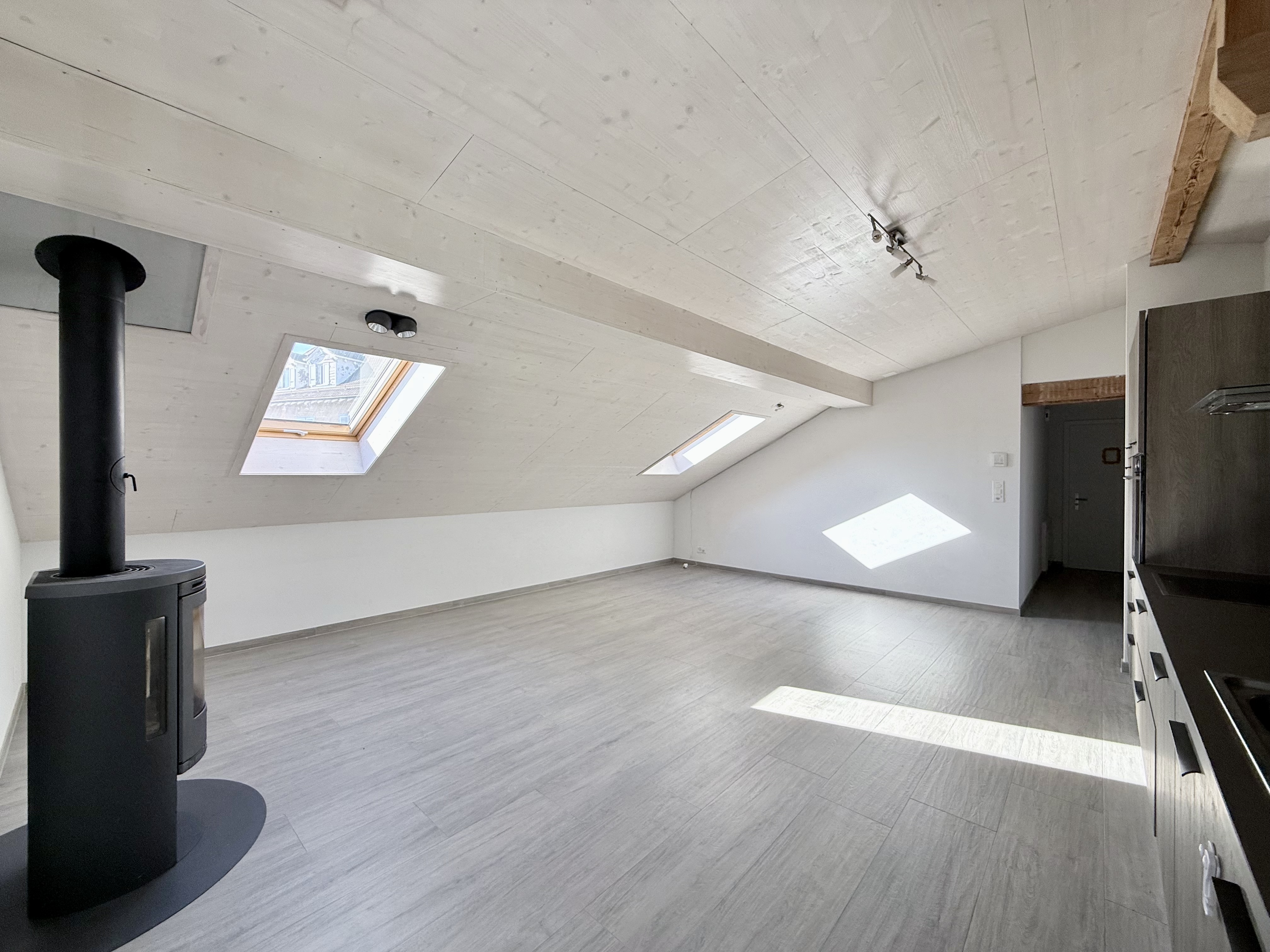 • Un grand séjour/salle à manger avec un poêle