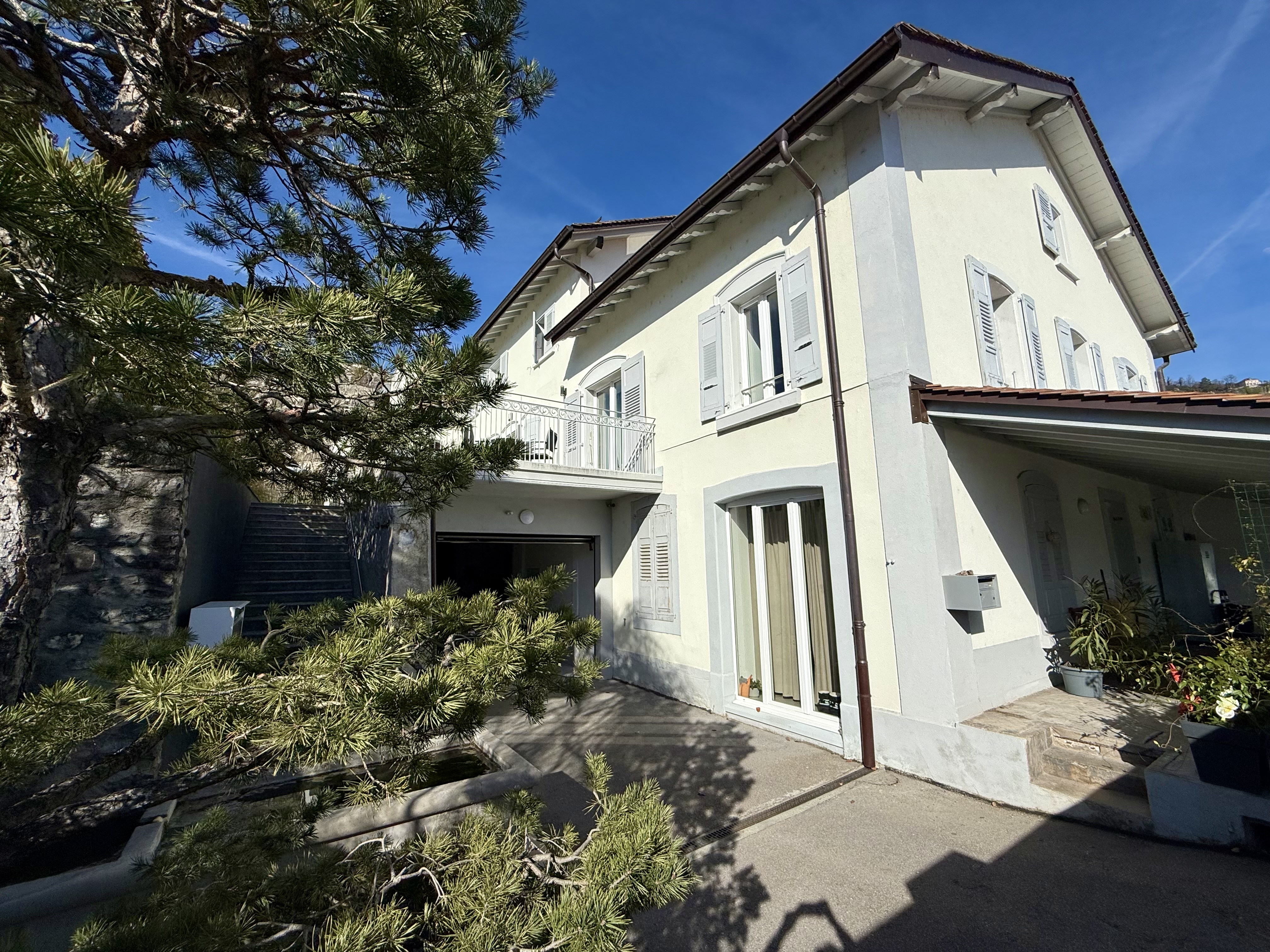 Située dans un quartier calme et résidentiel, cette belle villa jumelle bénéficie d’un emplacement privilégié, cachée dans un écrin de verdure tout en restant proche des transports (un arrêt de bus desservant le centre de Vevey se situe à quelques minutes de la maison), des accès autoroutiers, des commerces (la Coop et la Migros se situent à 4 min. en voiture) et des écoles primaires et secondaires de Blonay (5 min. en voiture).